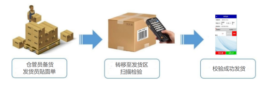倉(cāng)庫(kù)人員根據(jù)銷售人員的出貨計(jì)劃,安排銷售發(fā)貨。倉(cāng)庫(kù)人員使用手持終端設(shè)備掃描源單發(fā)貨通知單,并逐一掃描成品條碼,確認(rèn)出貨數(shù)據(jù)無(wú)誤后,系統(tǒng)生成銷售出庫(kù)單。