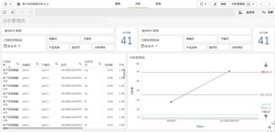 客戶化驗數(shù)據(jù)單的結(jié)果,通過BI的方式展現(xiàn)。數(shù)據(jù)的維度是批號,度量是化驗項目的檢驗值。查詢條件分成兩塊:一是根據(jù)日期范圍、母編號、子編號、產(chǎn)品名稱、批次號、分析項目來檢索數(shù)據(jù);二是根據(jù)日期范圍、母編號、子編號、產(chǎn)品名稱、批次號、分析項目來計算基準值(比如UCL、LCL、CL+2σ、CL-2σ等)。整體數(shù)據(jù)展示,增加顯示滿足篩選條件統(tǒng)計的批次總數(shù);圖表數(shù)據(jù)表格展示(左側(cè)表格);通過UCL、LCL、上限、下限、CL+2σ、CL-2σ、平均、cp、cpk這些基準值指標來分析檢測值展示檢驗結(jié)果的圖表(右側(cè)折線圖);增加分析項目檢測值單位顯示(折線圖左側(cè))。